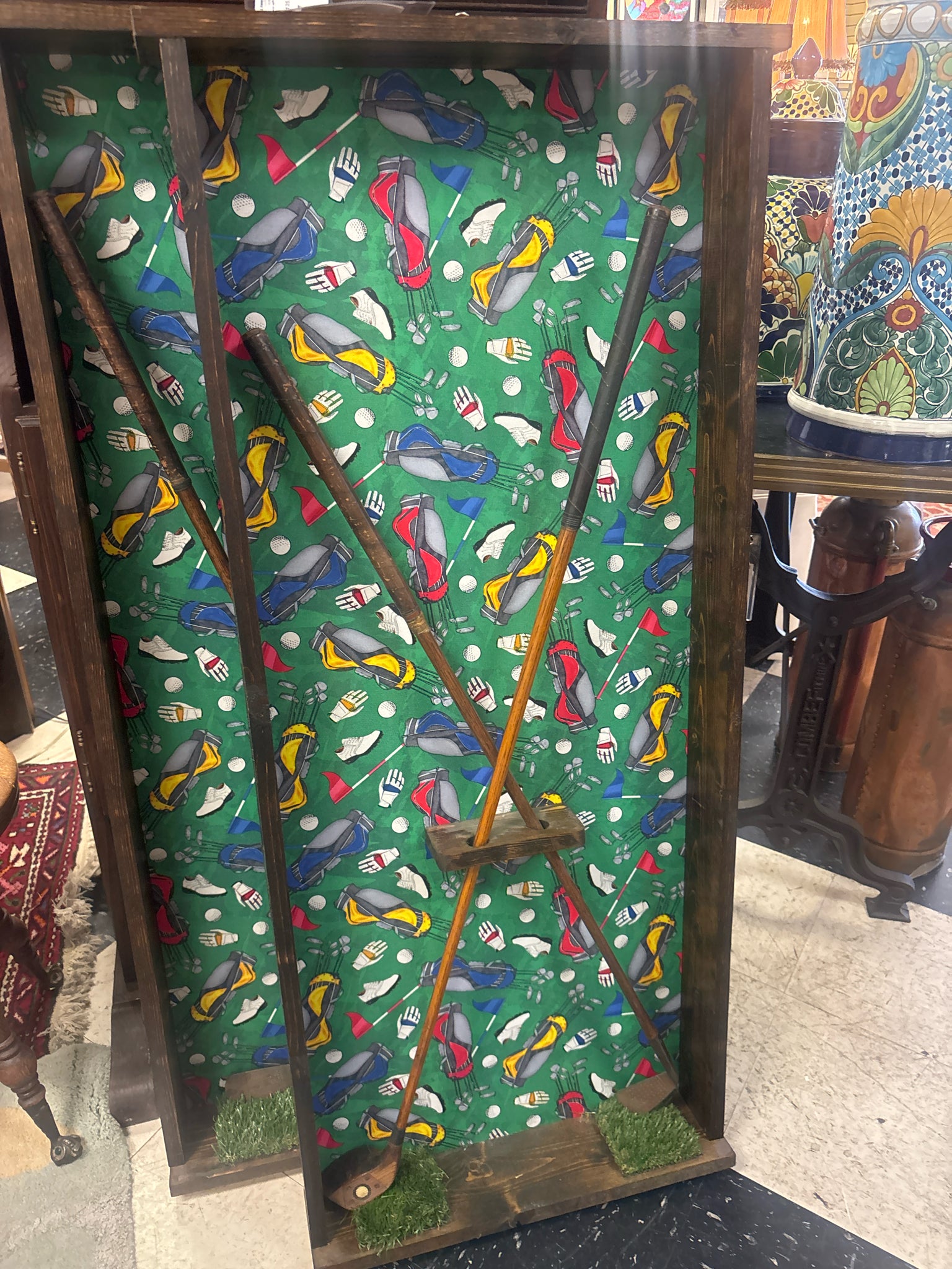 (22 x 48) Wooden Shadowbox w/Pair Antique Golf Clubs