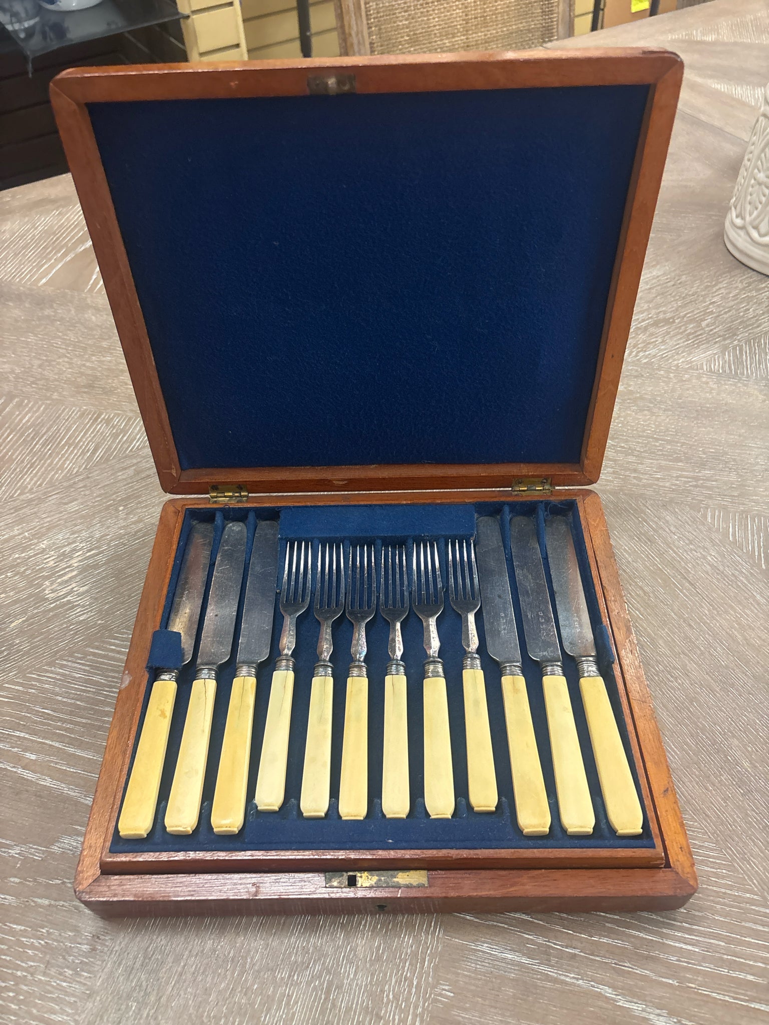 24pc Antique Sheffield Fish Utensils Service- Silver Plate/Ivory Handles