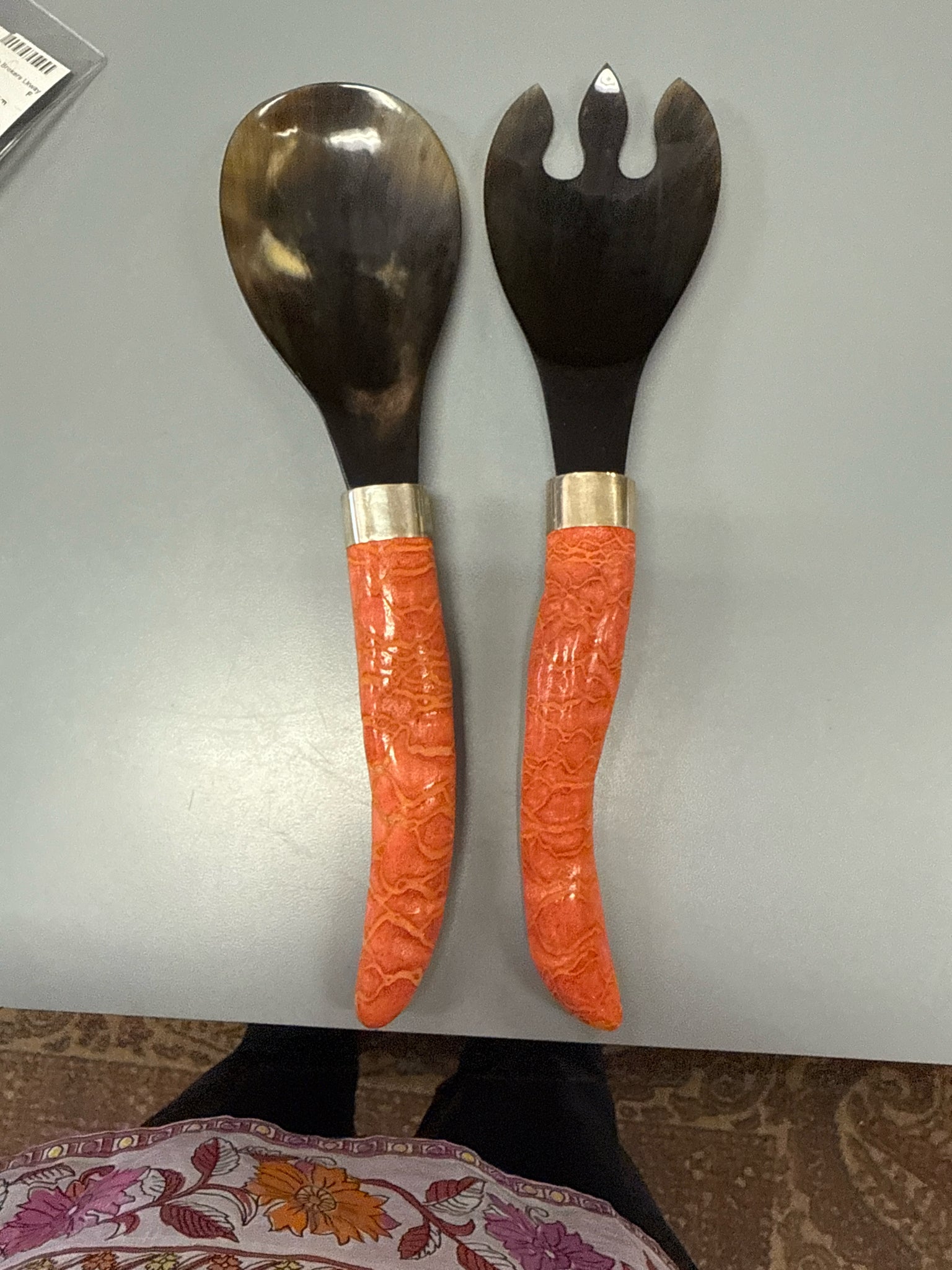 Buffalo Horn/Silver & Coral Textured Wood Salad Servers