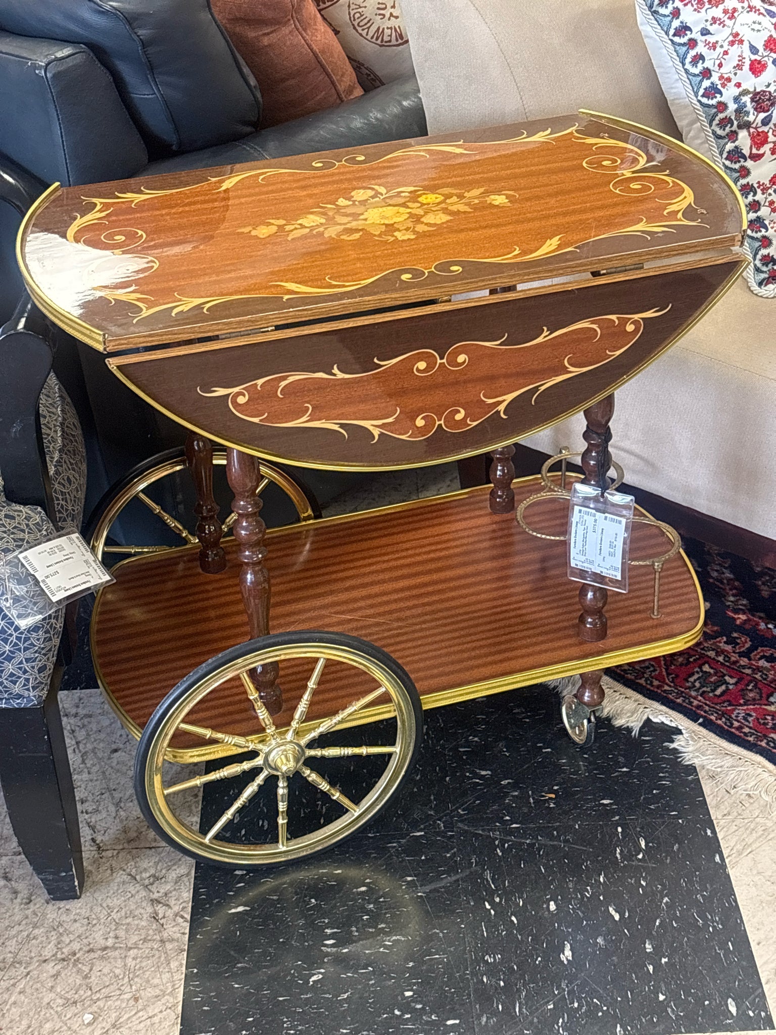Vintage Italian Marquetry Two Tiered Drop Leaf Tea/Bar/Serving Cart
